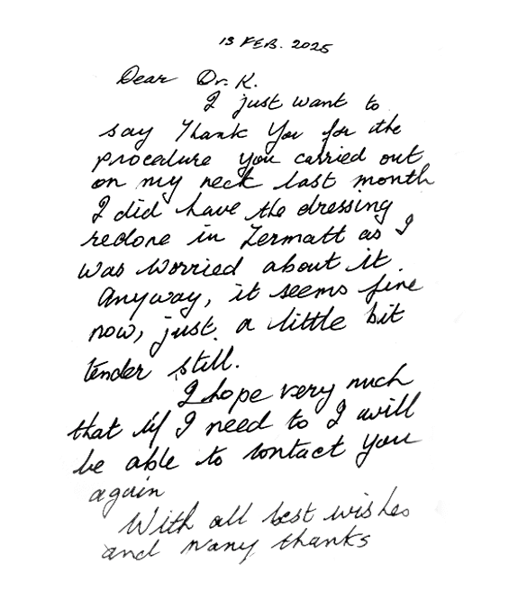"Mr K was kind friendly and did my operation very quickly only waited 3 days. He treated me as a person not a number and gave me reassurance everything would be fine. I would recommend him highly. He is a great surgeon and a really lovely man."